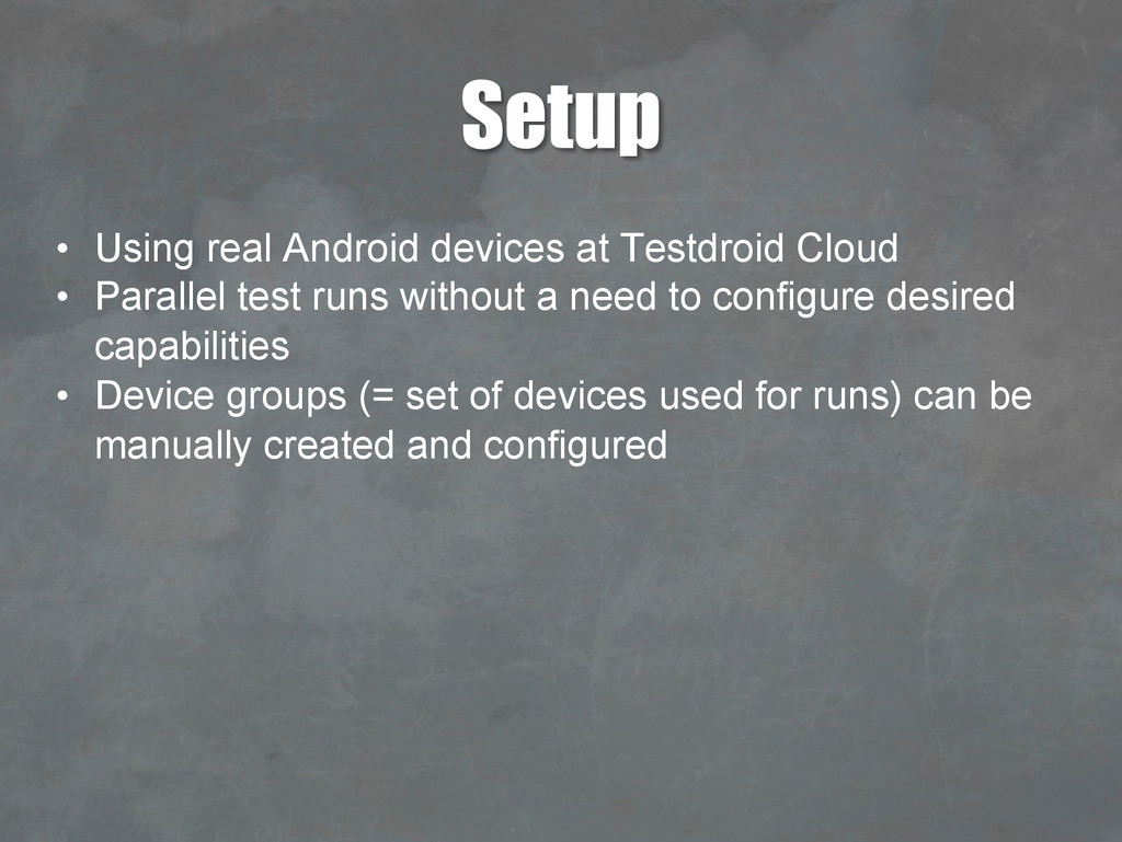 Parallel test runs without a need to configure desired capabilities • Device groups (= set of devices used for runs) can be manually created and configured
