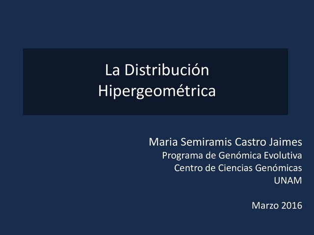 n, k, lower.tail = TRUE, log.p = FALSE) • dhyper(x, m, n, k, log = FALSE) • rhyper(nn, m, n, k) lower.tail = TRUE P[X ≤ x] lower.tail = FALSE P[X > x] U –> universo (total de bolitas en la caja) m -> éxitos posibles (rosas en U) n -> fallas posibles (el resto en U) q,x -> éxitos obtenidos (rosas en la muestra) k -> tamaño de muestra nn -> No. de observaciones Prob acumulada de que X llegue hasta cierto valor Prob de que X tome cierto valor
