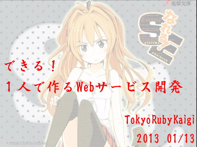 できる! 1人で作るWebサービス開発 http://bit.ly/xJSAef TokyoRubyKaigi 2013 01/13