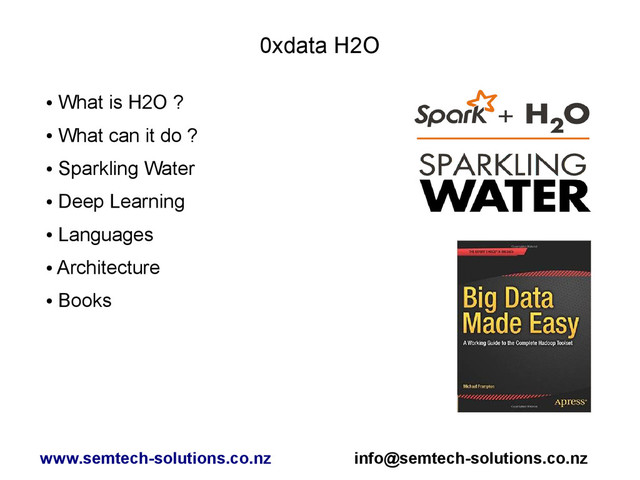 is it ? – Neural nets with deeper structures – Multiple learning functions – Automated learning • What does H2O bring to Spark ? – Extends functionality – Brings neural networks to Spark – Allows neural based classification – Many new algorithms www.semtech-solutions.co.nz [email protected]