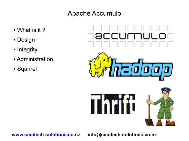 page • System and table config stored in Zoo Keeper • Table naming stored in Zoo Keeper via id's • Follow threads of execution using tracing – Record time actions take place • Accumulo can be used with Squirrel server – As next slide shows – Future presentation will cover Squirrel www.semtech-solutions.co.nz [email protected]