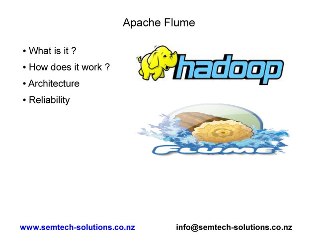agents which have – A source • Listen for events • Write events to channel – A channel • Queue event data as transactions – A sink • Write event data to target i.e. HDFS • Remove event from queue www.semtech-solutions.co.nz [email protected]