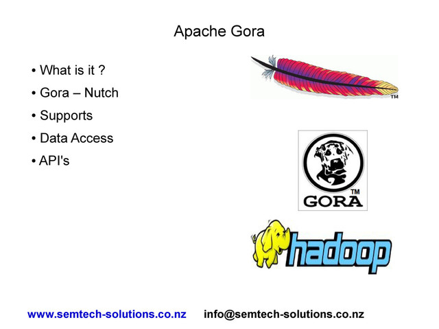 Apache 2 license • Written in Java • Offers a persistence framework • Designed for big data applications • Used by Nutch 2.x for web crawl data storage • Used for – Persistence – Indexing – Analytics www.semtech-solutions.co.nz [email protected]