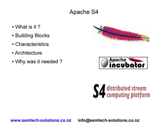modular • Written in Java • Currently in the Apache incubator • Offers plug-ins • For complex data stream processing • Production deployment at Yahoo www.semtech-solutions.co.nz [email protected]