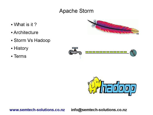 They are complementary technologies • They might both be used in a single system • Storm to process real time streams of data • Hadoop and M/R to process batched data on HDFS www.semtech-solutions.co.nz [email protected]
