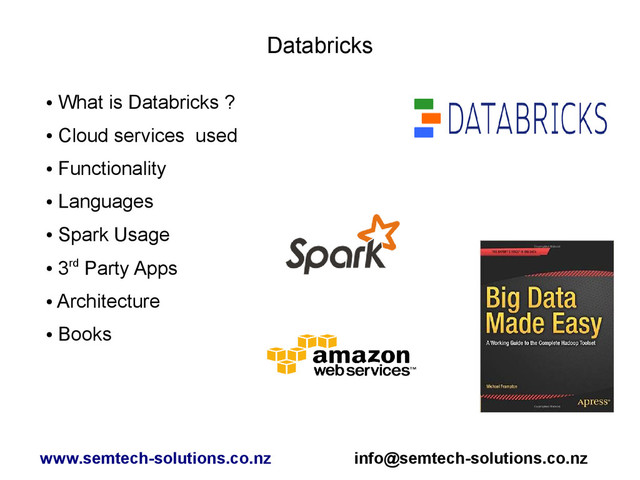 i.e. DB 1.3.4 uses Spark 1.3.1 at June 2015 • All Spark modules available – SQL, GraphX, MlLib, Streaming • Strong integration between modules and visualisation • Extensive use of tables to import data • Tables available via SQL www.semtech-solutions.co.nz [email protected]