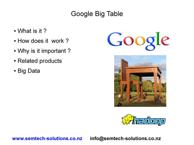 Google file system and Chubby Lock service • Storage and versioning based upon time stamps – Data sorted by youngest first • No validation, validation left to client • Allows for hardware and system failure via redundancy • Arbitrary row columns • Arbitrary column data types • Very high data throughput www.semtech-solutions.co.nz [email protected]
