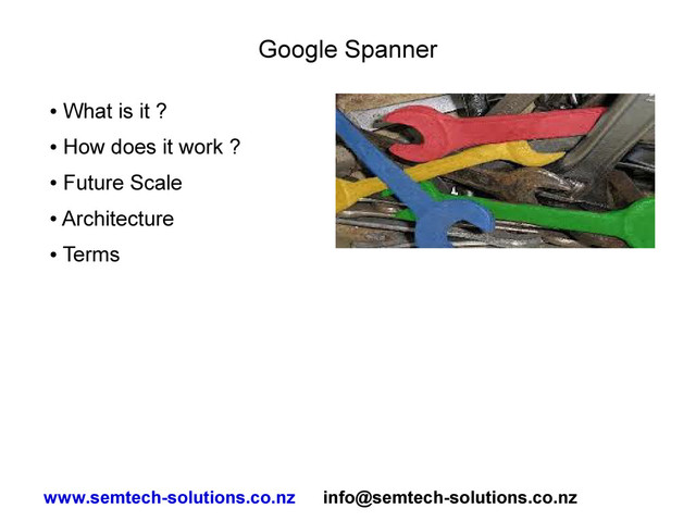 a true time API – Atomic clocks – GPS Clocks – Locally determine accurate time – No need for global time sync • One single global name space • Data stored globally via directory namespace • Uses a Paxos algorithm www.semtech-solutions.co.nz [email protected]