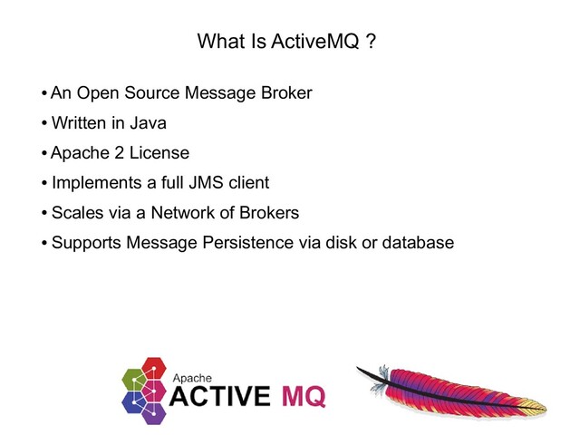 This presentation gives an overview of the Apache ActiveMQ project. It covers areas like protocols, containers, libraries, AJAX, Artemis and WebSockets.