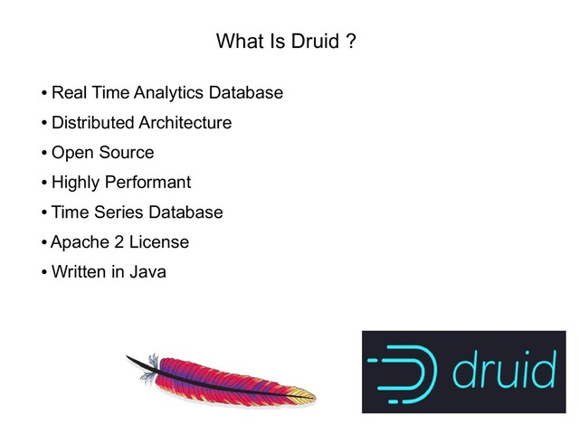 This presentation gives an overview of the Apache Druid project. It covers areas like use cases, features, architecture and users.