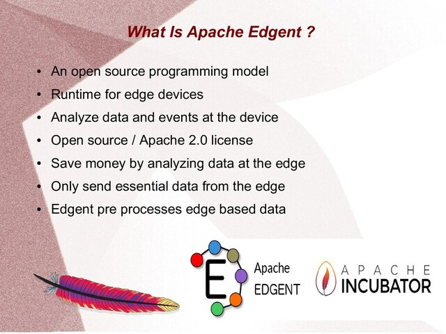 This presentation gives an overview of the Apache Edgent project. It explains Edgent in terms of edge of network IOT analytics. It also explains the Edgent API, cookbook and console.