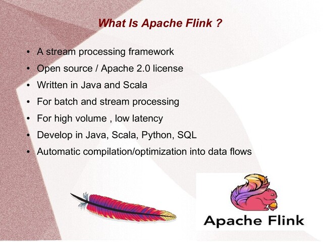 This presentation gives an overview of the Apache Flink project. It explains Flink in terms of its architecture, use cases and the manner in which it works.