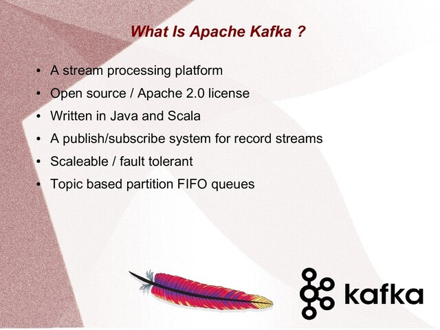 This presentation gives an overview of the Apache Kafka project. It covers areas like producer, consumer, topic, partitions, API's, architecture and usage.