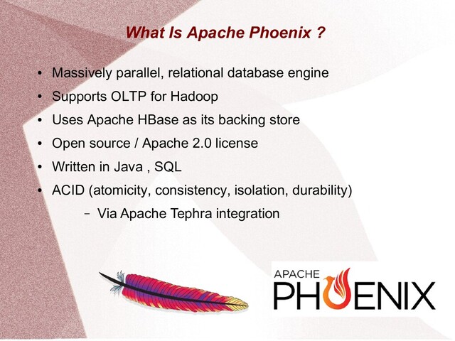 This presentation gives an overview of the Apache Phoenix project. It explains Phoenix in terms of its architecture, environment, ETL, SQL, UDF's and transactions.