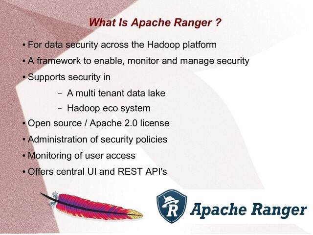 This presentation gives an overview of the Apache Ranger project. It explains Apache Ranger in terms of it's architecture, security, audit and plugin features.