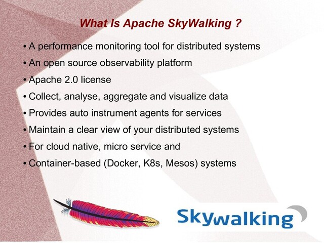 This presentation gives an overview of the Apache SkyWalking project. It explains Apache SkyWalking in terms of it's architecture, protocols, users and languages supported.
