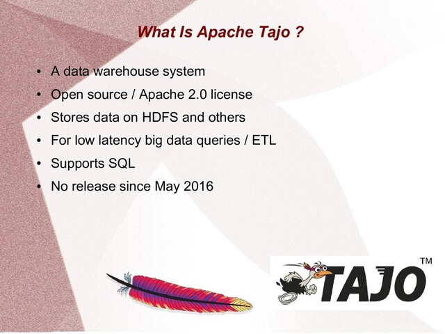 This presentation gives an overview of the Apache Tajo project. It explains Tajo architecture in relation to Hadoop/Hive and ETL.
