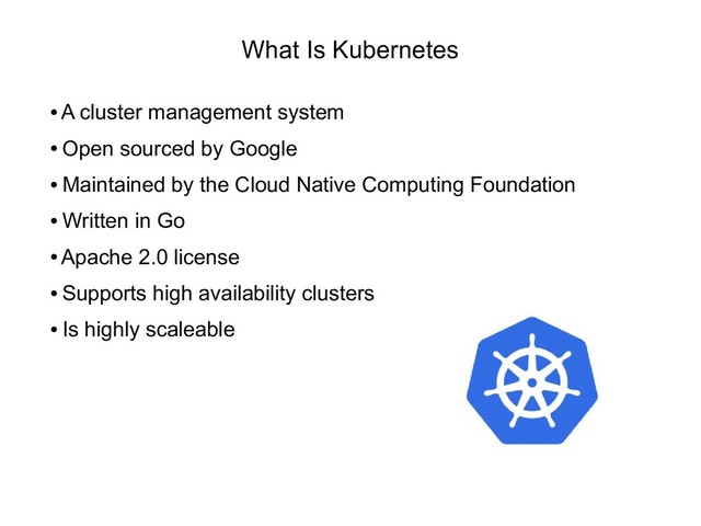 This presentation attempts to give an overview of the Kubernetes cluster management system. It examines the system at a high level. For further details please see the links below.