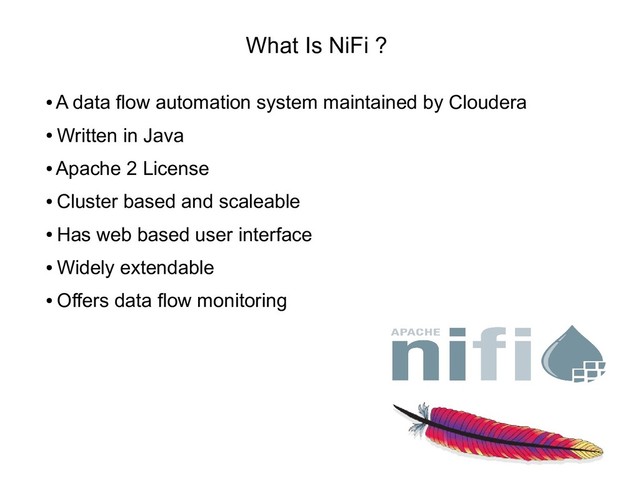 This presentation attempts to give an overview of the Apache NiFi flow management system currently included in Cloudera's CDF product.