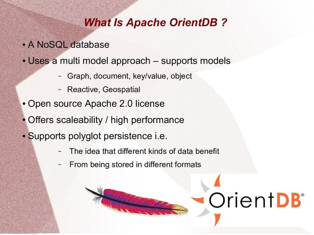 This presentation gives an overview of the OrientDB database project. It explains OrientDB in terms of it's functionality, its indexing and architecture. It examines the ETL functionality as well as the UI available.