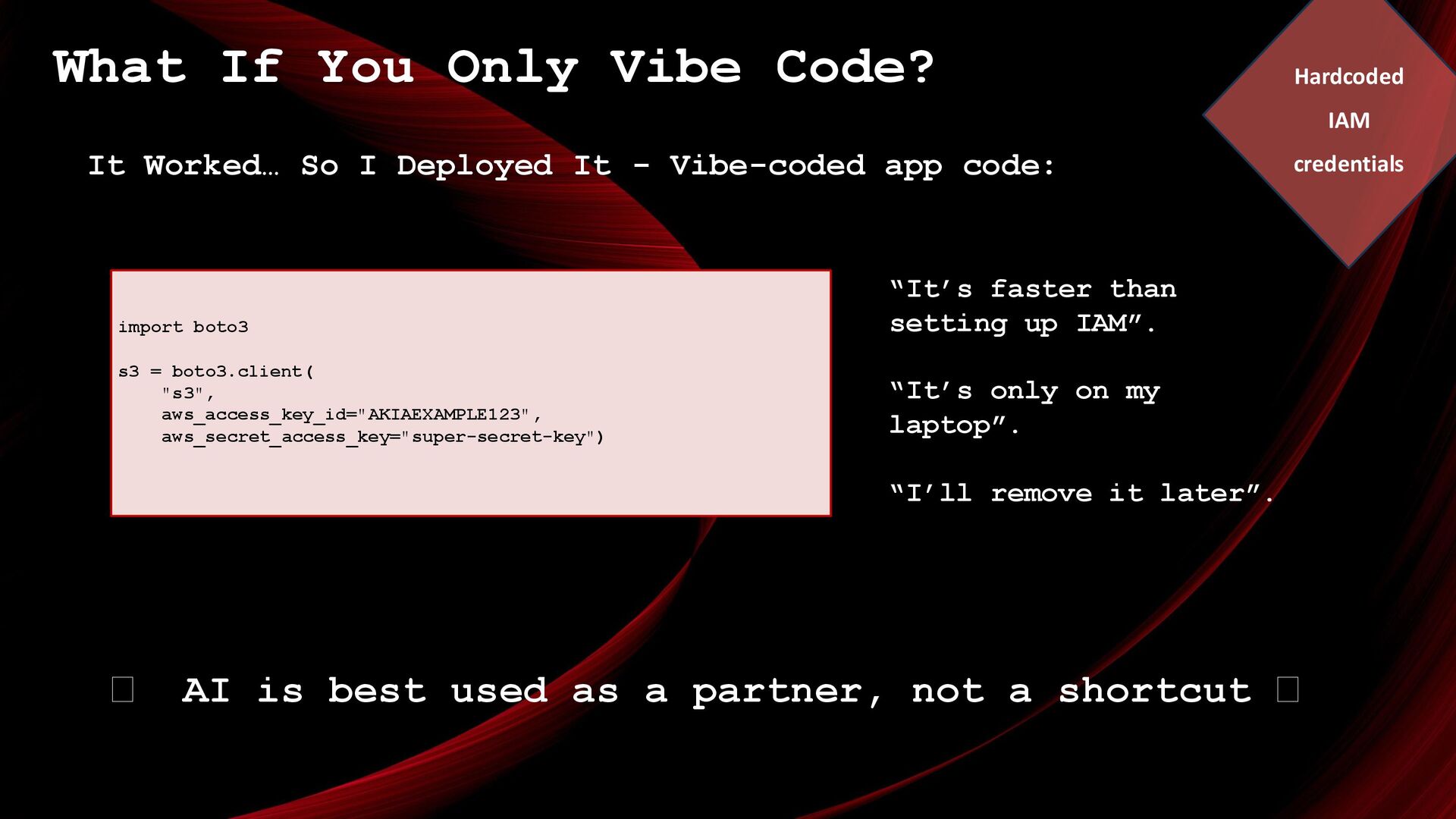 Deployed It - Vibe-coded app code: 🪭 AI is best used as a partner, not a shortcut 🪭 import boto3 s3 = boto3.client( "s3", aws_access_key_id="AKIAEXAMPLE123", aws_secret_access_key="super-secret-key") “It’s faster than setting up IAM”. “It’s only on my laptop”. “I’ll remove it later”. Hardcoded IAM credentials
