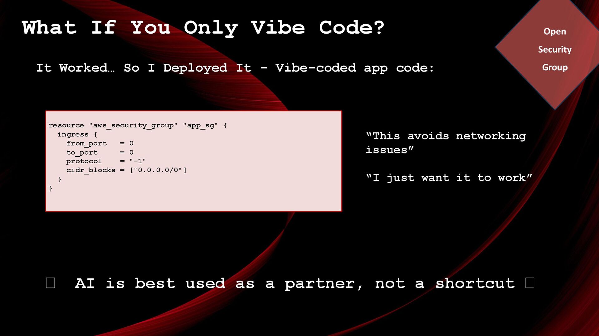 Deployed It - Vibe-coded app code: 🪭 AI is best used as a partner, not a shortcut 🪭 resource "aws_security_group" "app_sg" { ingress { from_port = 0 to_port = 0 protocol = "-1" cidr_blocks = ["0.0.0.0/0"] } } “This avoids networking issues” “I just want it to work” Open Security Group