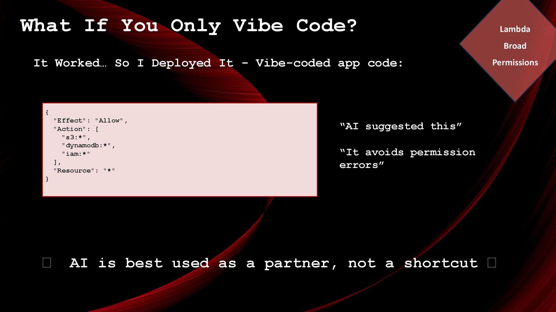 Deployed It - Vibe-coded app code: 🪭 AI is best used as a partner, not a shortcut 🪭 { "Effect": "Allow", "Action": [ "s3:*", "dynamodb:*", "iam:*" ], "Resource": "*" } “AI suggested this” “It avoids permission errors” Lambda Broad Permissions