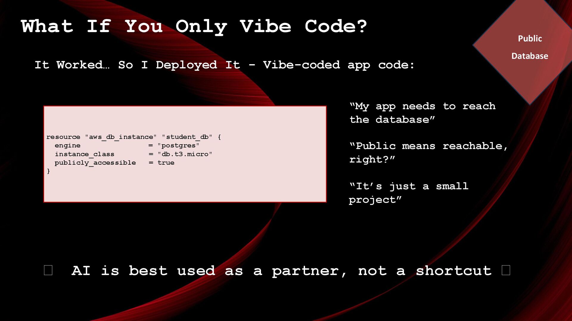 Deployed It - Vibe-coded app code: 🪭 AI is best used as a partner, not a shortcut 🪭 resource "aws_db_instance" "student_db" { engine = "postgres" instance_class = "db.t3.micro" publicly_accessible = true } “My app needs to reach the database” “Public means reachable, right?” “It’s just a small project” Public Database