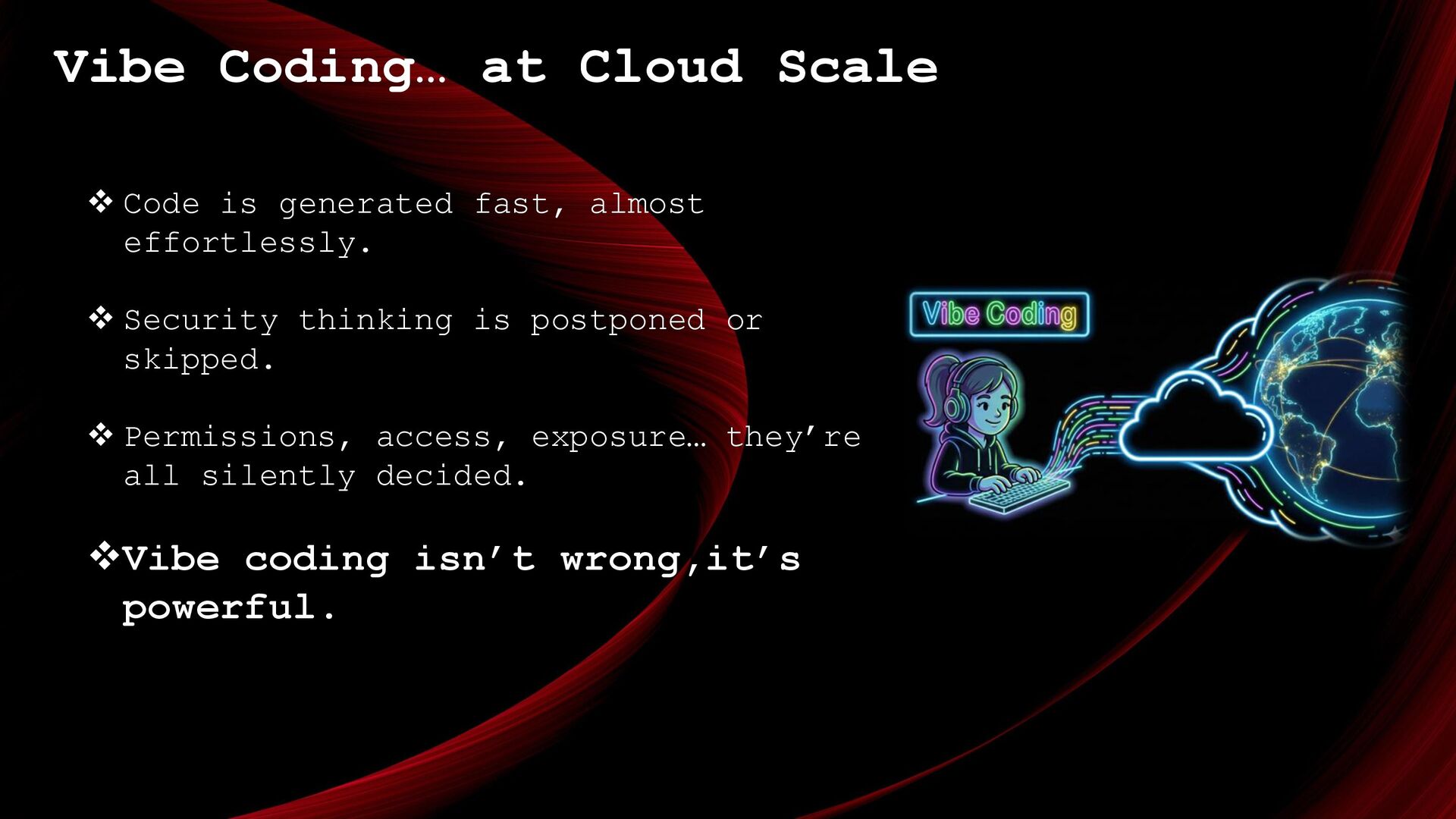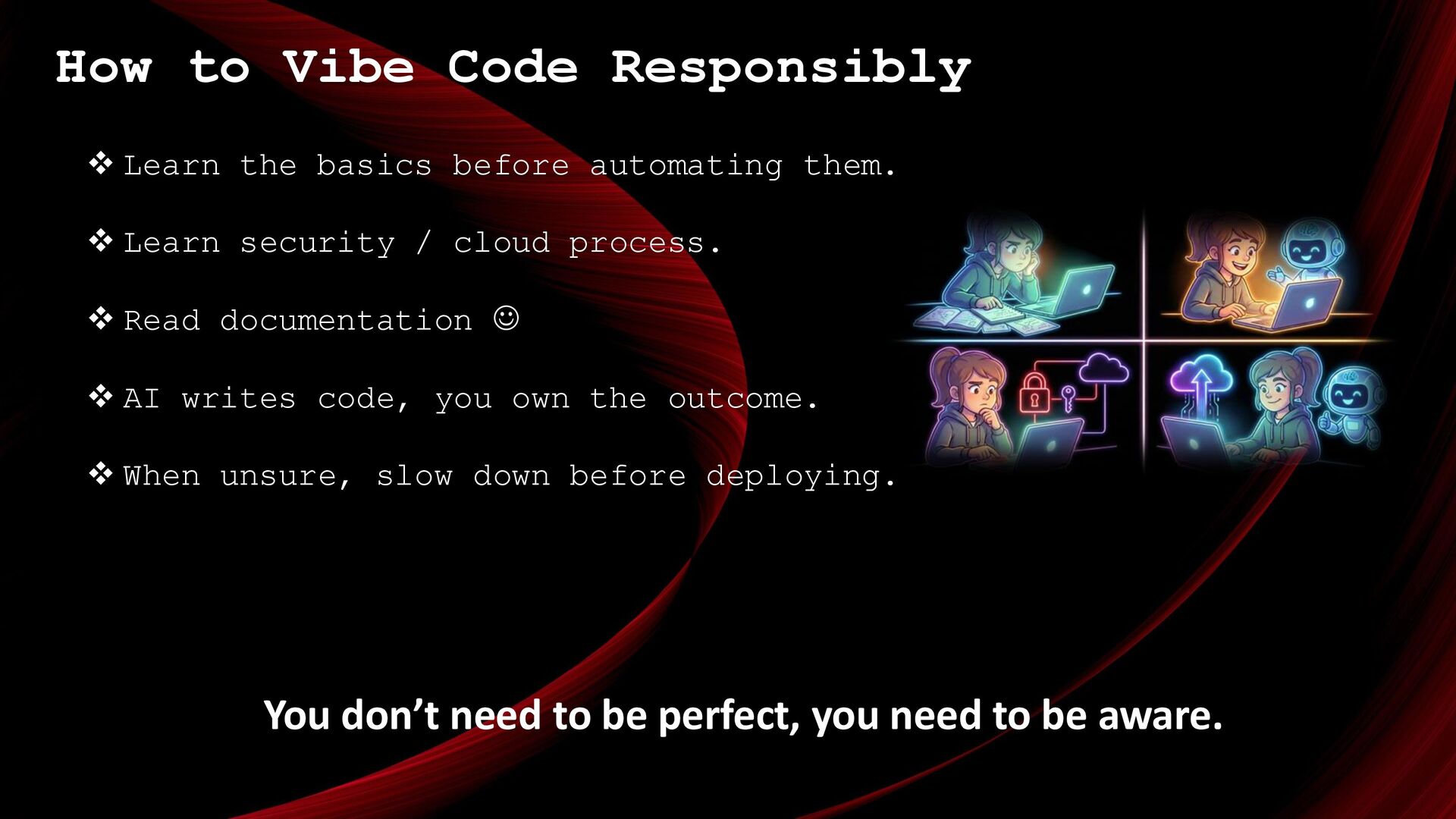 automating them. ❖ Learn security / cloud process. ❖ Read documentation ☺ ❖ AI writes code, you own the outcome. ❖ When unsure, slow down before deploying. You don’t need to be perfect, you need to be aware.