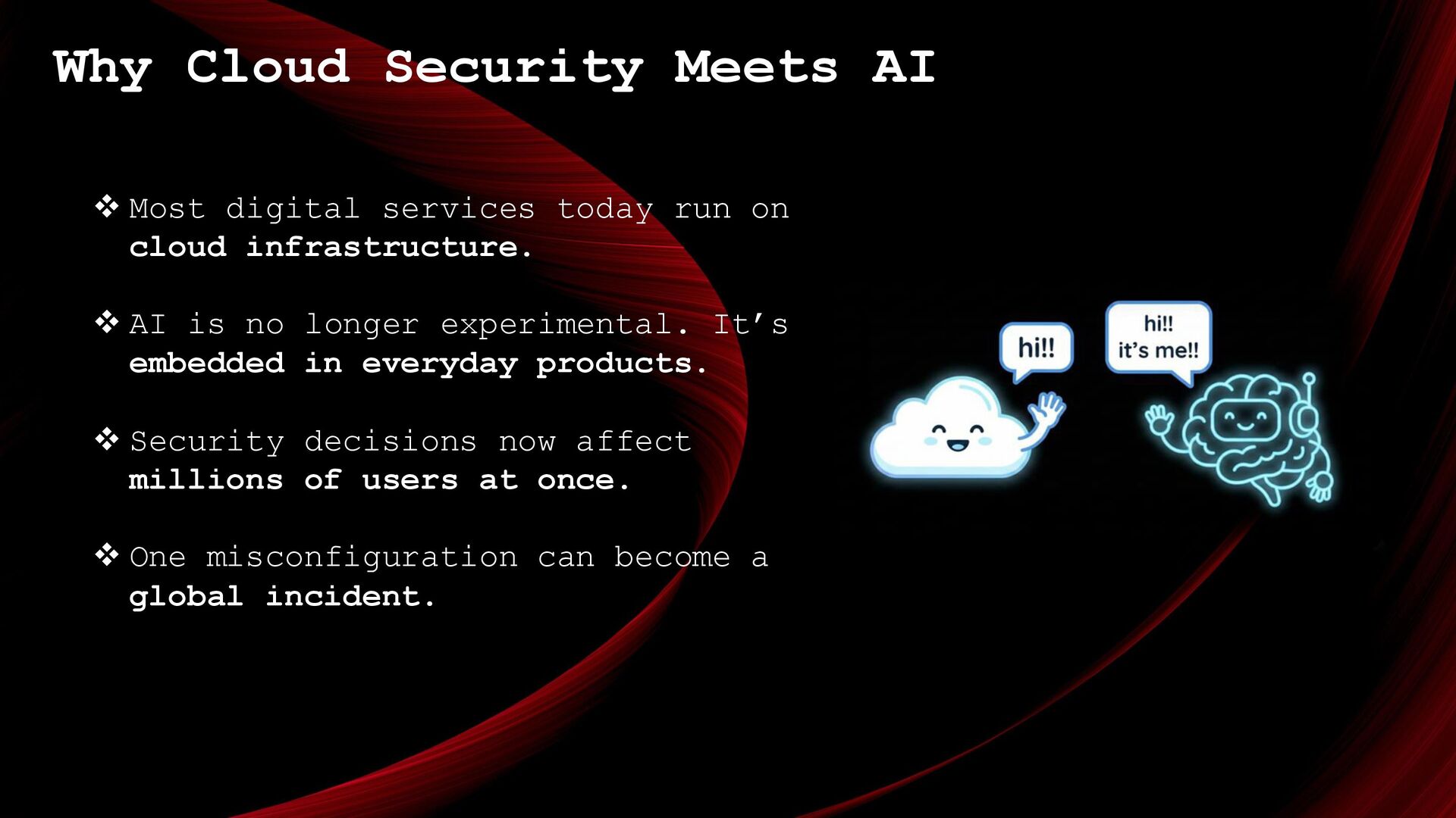 run on cloud infrastructure. ❖ AI is no longer experimental. It’s embedded in everyday products. ❖ Security decisions now affect millions of users at once. ❖ One misconfiguration can become a global incident.