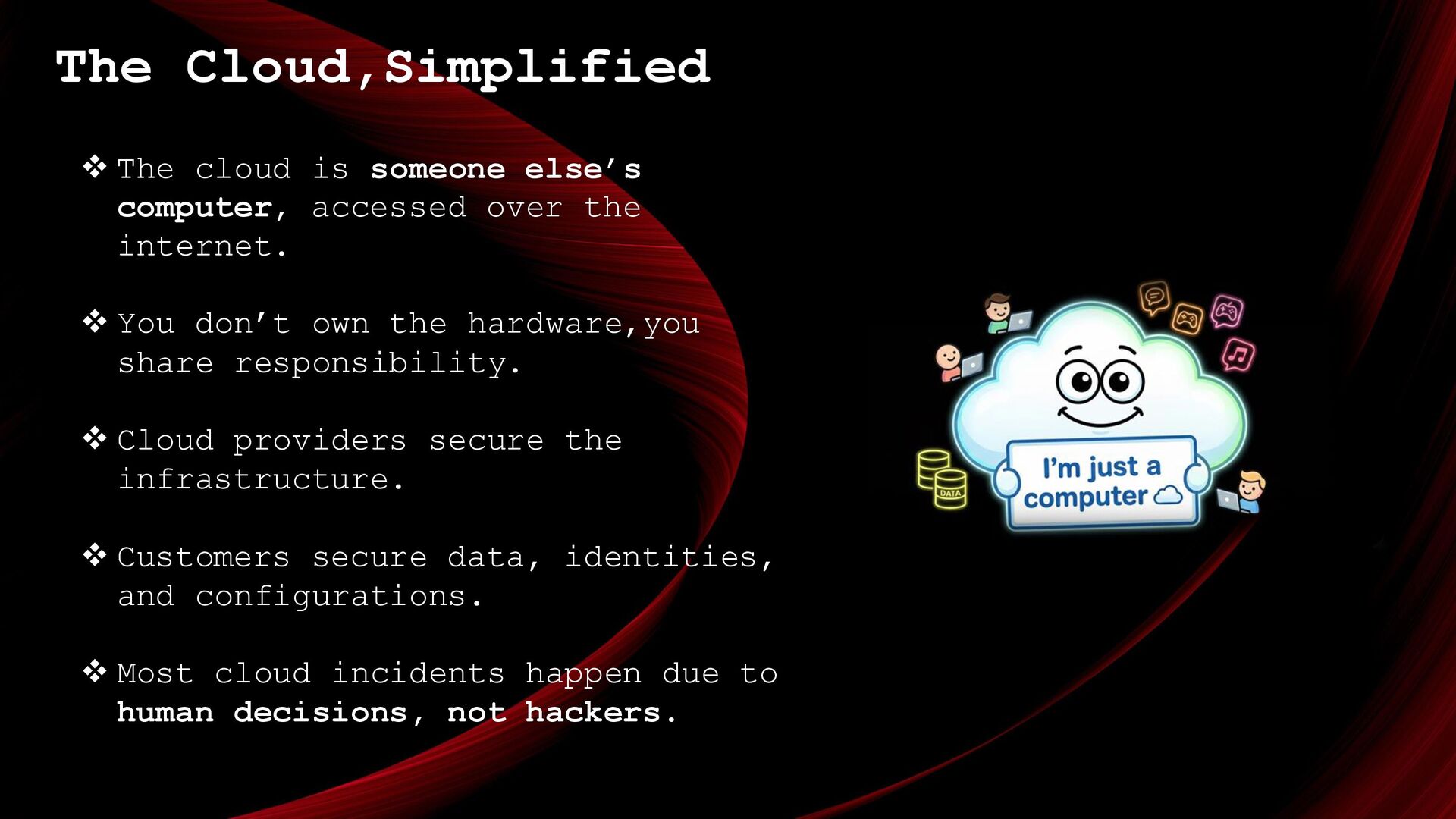 over the internet. ❖ You don’t own the hardware,you share responsibility. ❖ Cloud providers secure the infrastructure. ❖ Customers secure data, identities, and configurations. ❖ Most cloud incidents happen due to human decisions, not hackers.