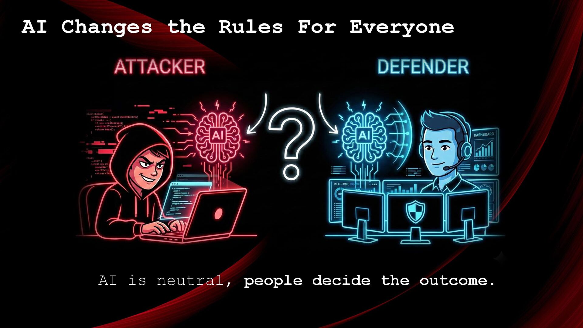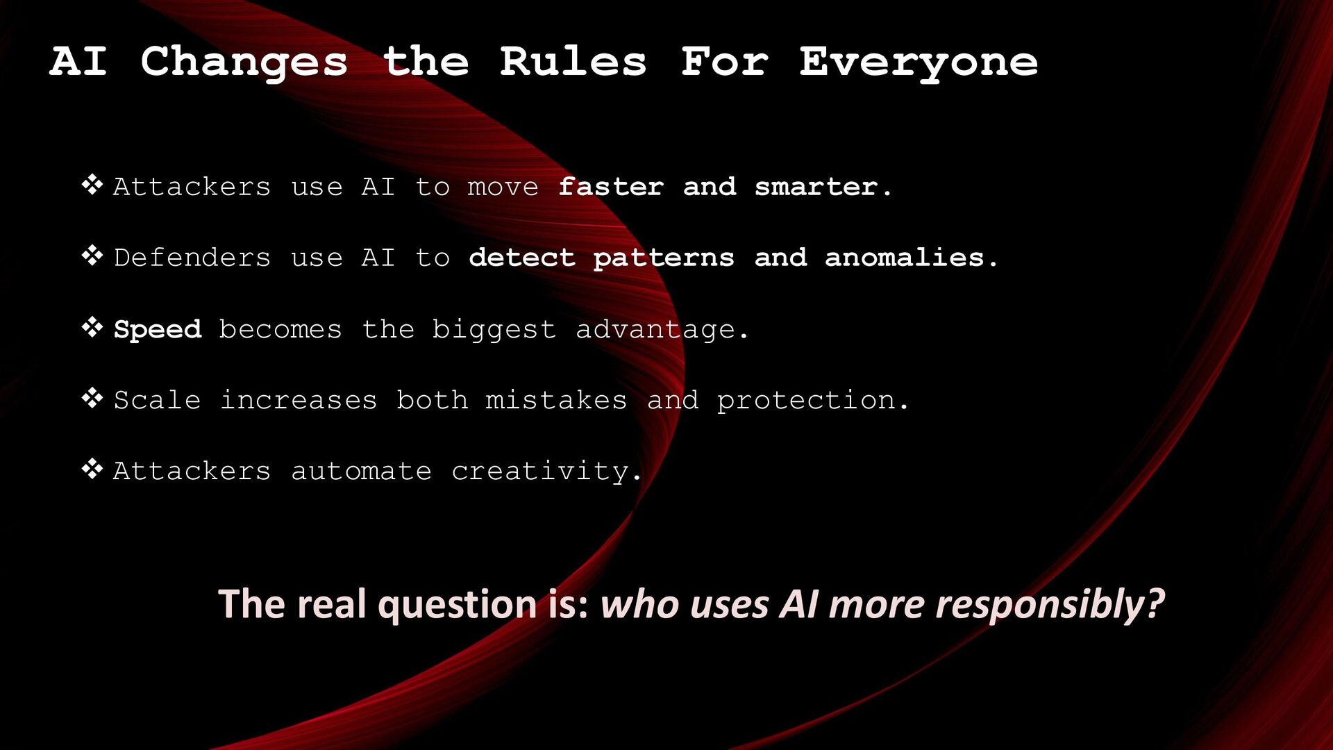 to move faster and smarter. ❖ Defenders use AI to detect patterns and anomalies. ❖ Speed becomes the biggest advantage. ❖ Scale increases both mistakes and protection. ❖ Attackers automate creativity. The real question is: who uses AI more responsibly?