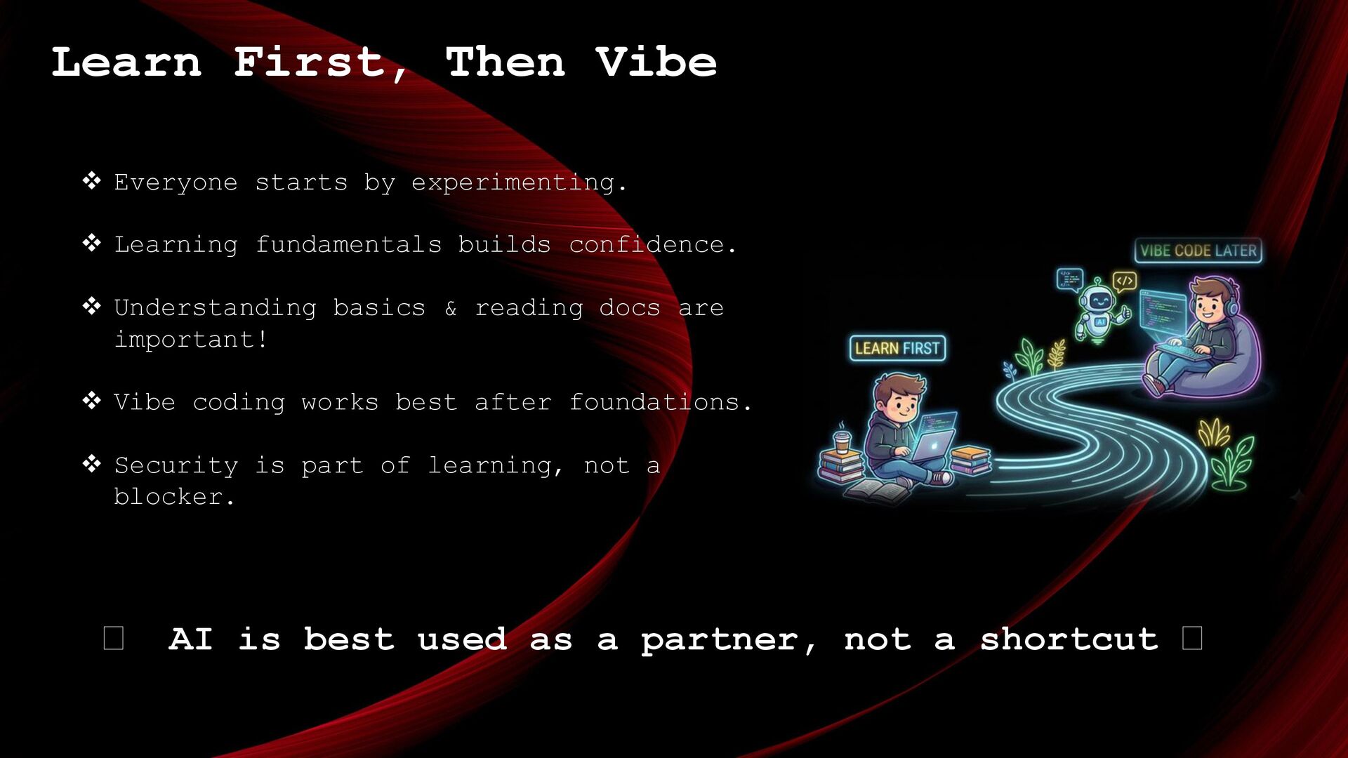 Learning fundamentals builds confidence. ❖ Understanding basics & reading docs are important! ❖ Vibe coding works best after foundations. ❖ Security is part of learning, not a blocker. 🪭 AI is best used as a partner, not a shortcut 🪭