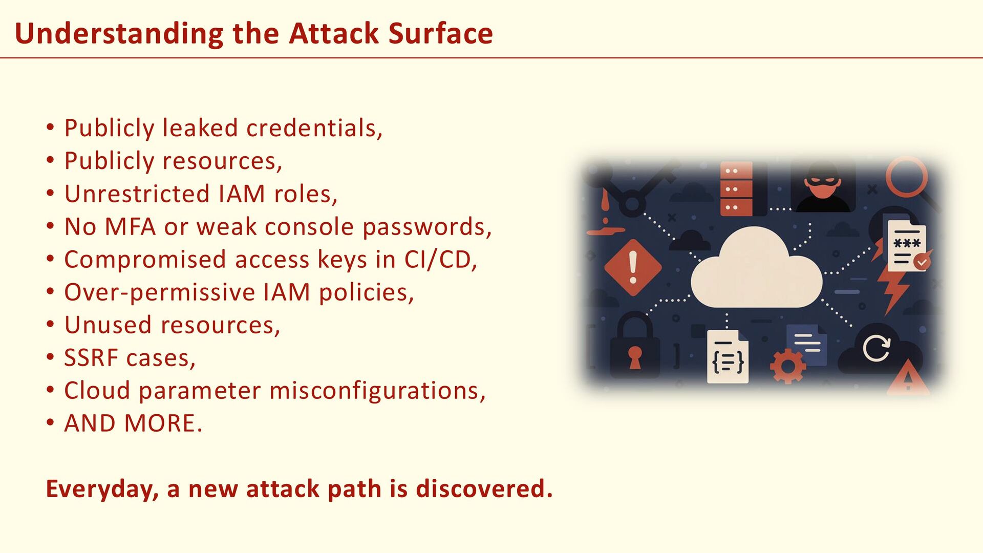 resources, • Unrestricted IAM roles, • No MFA or weak console passwords, • Compromised access keys in CI/CD, • Over-permissive IAM policies, • Unused resources, • SSRF cases, • Cloud parameter misconfigurations, • AND MORE. Everyday, a new attack path is discovered.