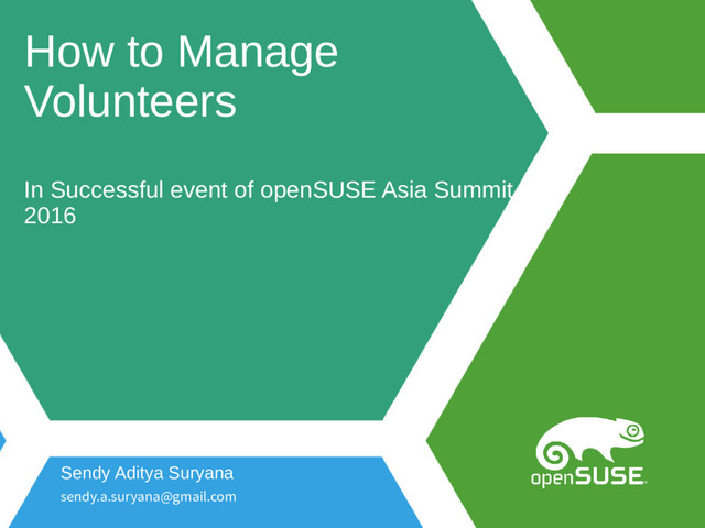 a promise by any participating organisation to develop, deliver, or market a product. It is not a commitment to deliver any material, code, or functionality, and should not be relied upon in making purchasing decisions. openSUSE makes no representations or tarranties tith respect to the contents of this document, and specifically disclaims any express or implied tarranties of merchantability or fitness for any particular purpose. The development, release, and timing of features or functionality described for openSUSE products remains at the sole discretion of openSUSE. Further, openSUSE reserves the right to revise this document and to make changes to its content, at any time, tithout obligation to notify any person or entity of such revisions or changes. All openSUSE marks referenced in this presentation are trademarks or registered trademarks of SUSE LLC, in the United States and other countries. All third-party trademarks are the property of their respective otners. License This slide deck is licensed under the Creative Commons Attribution-ShareAlike 4.0 International license. It can be shared and adapted for any purpose (even commercially) as long as Attribution is given and any derivative tork is distributed under the same license. Details can be found at https://creativecommons.org/licenses/by-sa/4.0/ Credits Template Richard Brotn [email protected] Design & Inspiration openSUSE Design Team http://opensuse.github.io/branding- guidelines/