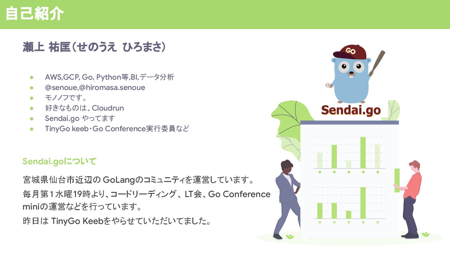 モノノフです。 • 好きなものは、Cloudrun • Sendai.go やってます • TinyGo keeb・Go Conference実行委員など 自己紹介 Sendai.goについて 宮城県仙台市近辺の GoLangのコミュニティを運営しています。 毎月第1水曜19時より、コードリーディング、 LT会、Go Conference miniの運営などを行っています。 昨日は TinyGo Keebをやらせていただいてました。