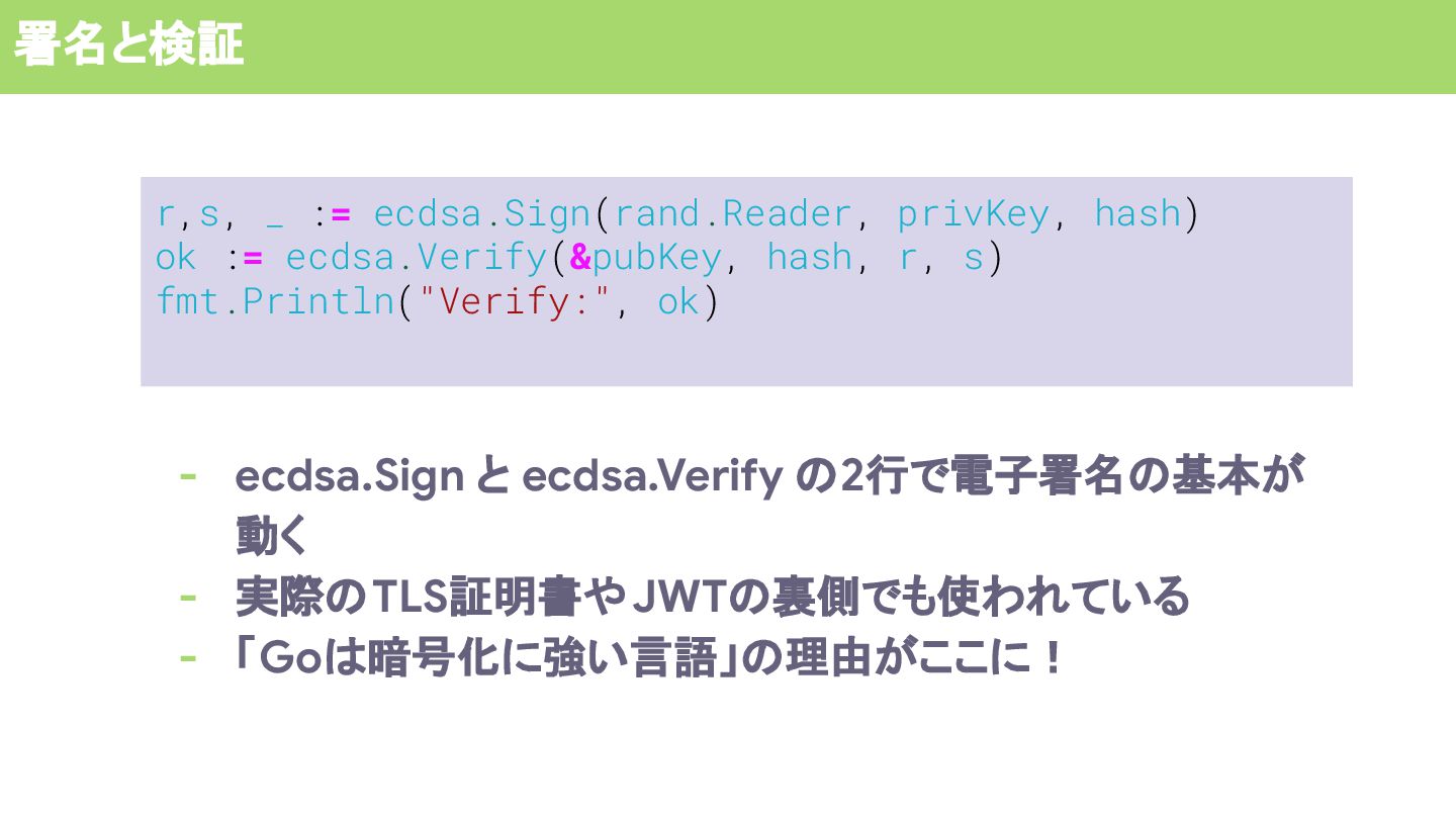 - ecdsa.Sign と ecdsa.Verify の2行で電子署名の基本が 動く - 実際のTLS証明書やJWTの裏側でも使われている - 「Goは暗号化に強い言語」の理由がここに!