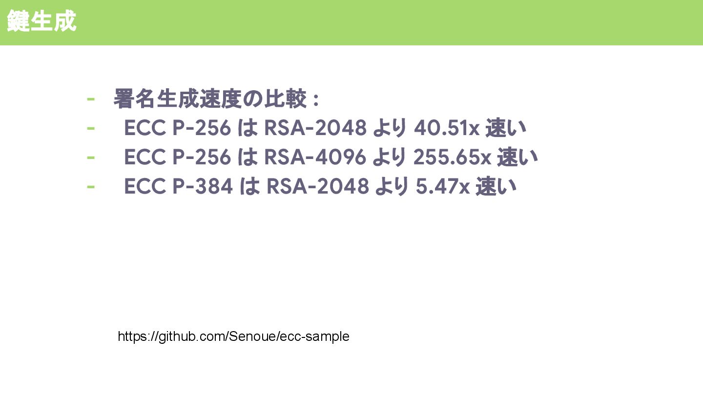 - 署名生成速度の比較 : - ECC P-256 は RSA-2048 より 40.51x
