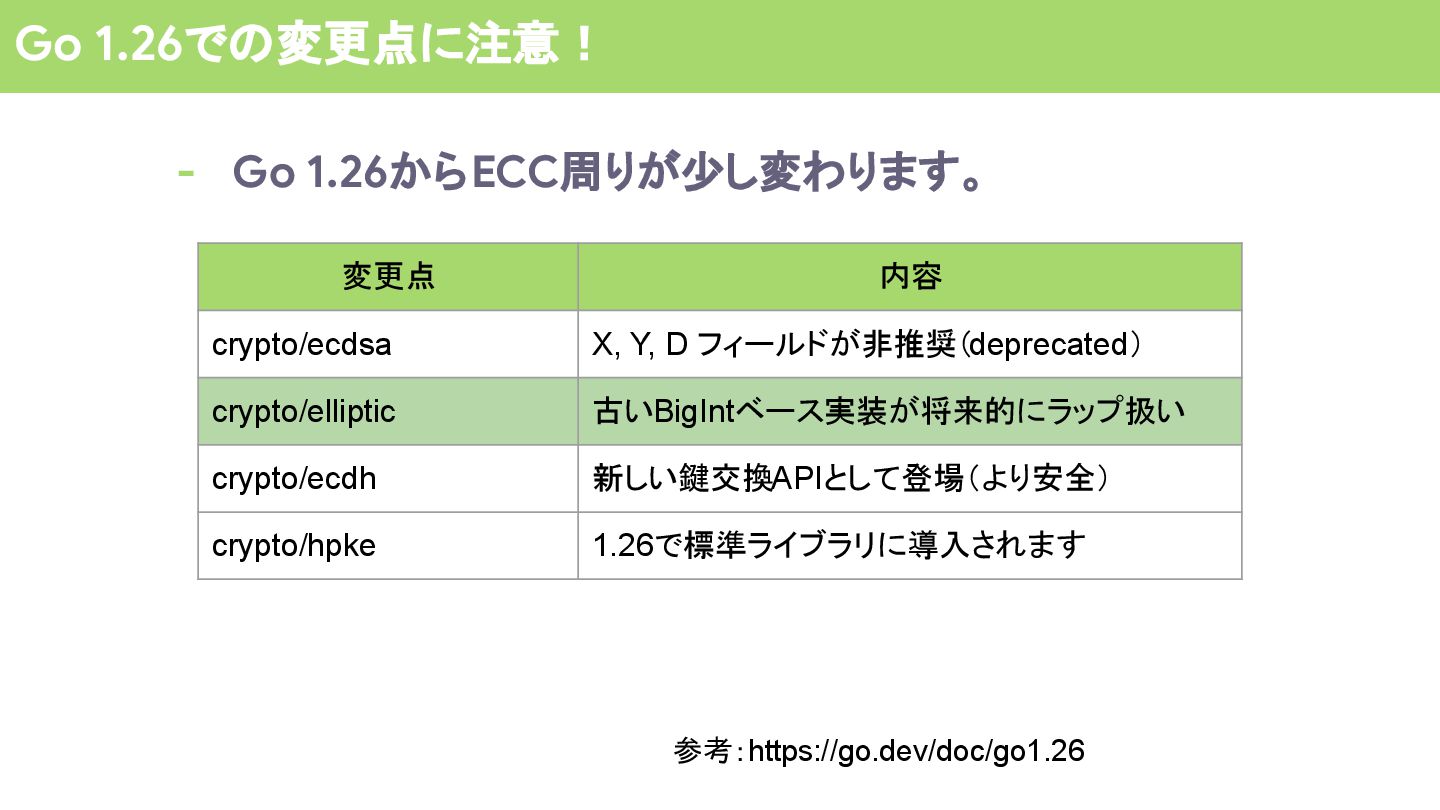 - Go 1.26からECC周りが少し変わります。 Go 1.26での変更点に注意! 変更点 内容 crypto/ecdsa X, Y,