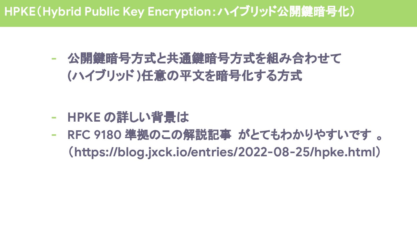 - 公開鍵暗号方式と共通鍵暗号方式を組み合わせて (ハイブリッド )任意の平文を暗号化する方式 - HPKE の詳しい背景は - RFC 9180