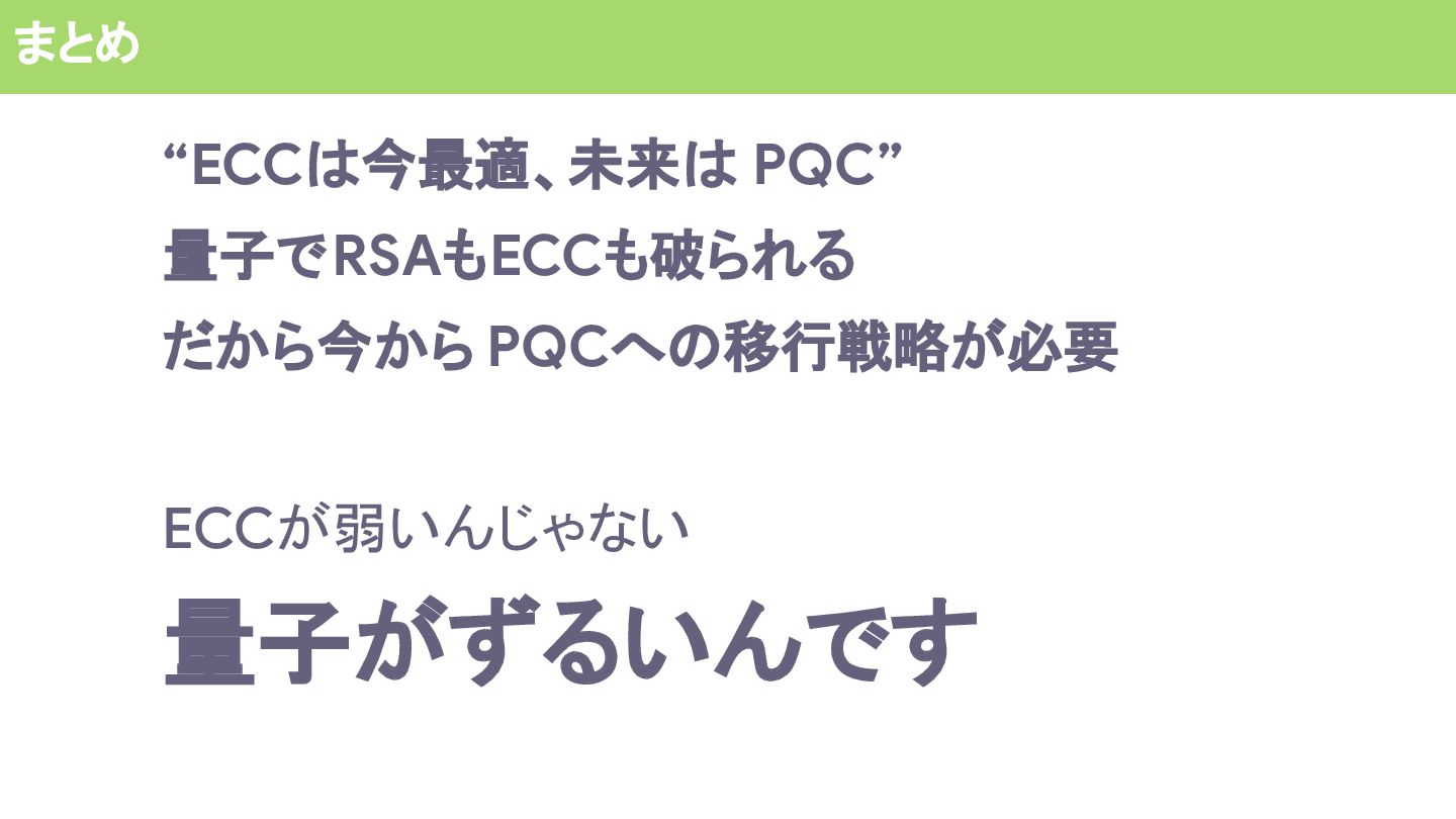 “ECCは今最適、未来は PQC” 量子でRSAもECCも破られる だから今から PQCへの移行戦略が必要 ECCが弱いんじゃない 量子がずるいんです まとめ