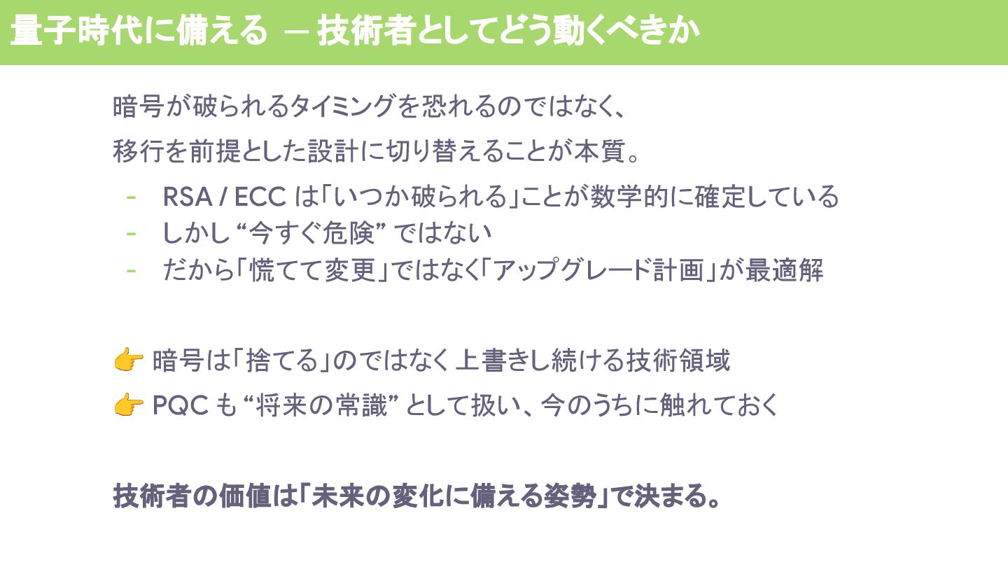 暗号が破られるタイミングを恐れるのではなく、 移行を前提とした設計に切り替えることが本質。 - RSA / ECC は「いつか破られる」ことが数学的に確定している - しかし “今すぐ危険”
