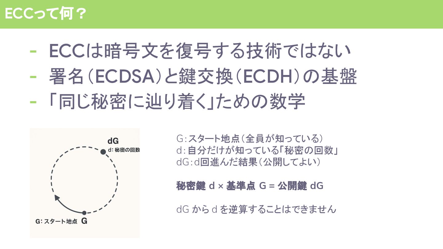 - ECCは暗号文を復号する技術ではない - 署名(ECDSA)と鍵交換(ECDH)の基盤 - 「同じ秘密に辿り着く」ための数学 ECCって何? G:スタート地点(全員が知っている) d:自分だけが知っている「秘密の回数」 dG:d回進んだ結果(公開してよい)