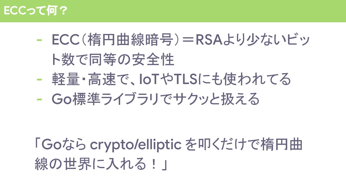 - ECC(楕円曲線暗号)=RSAより少ないビッ ト数で同等の安全性 - 軽量・高速で、IoTやTLSにも使われてる - Go標準ライブラリでサクッと扱える 「Goなら crypto/elliptic を叩くだけで楕円曲