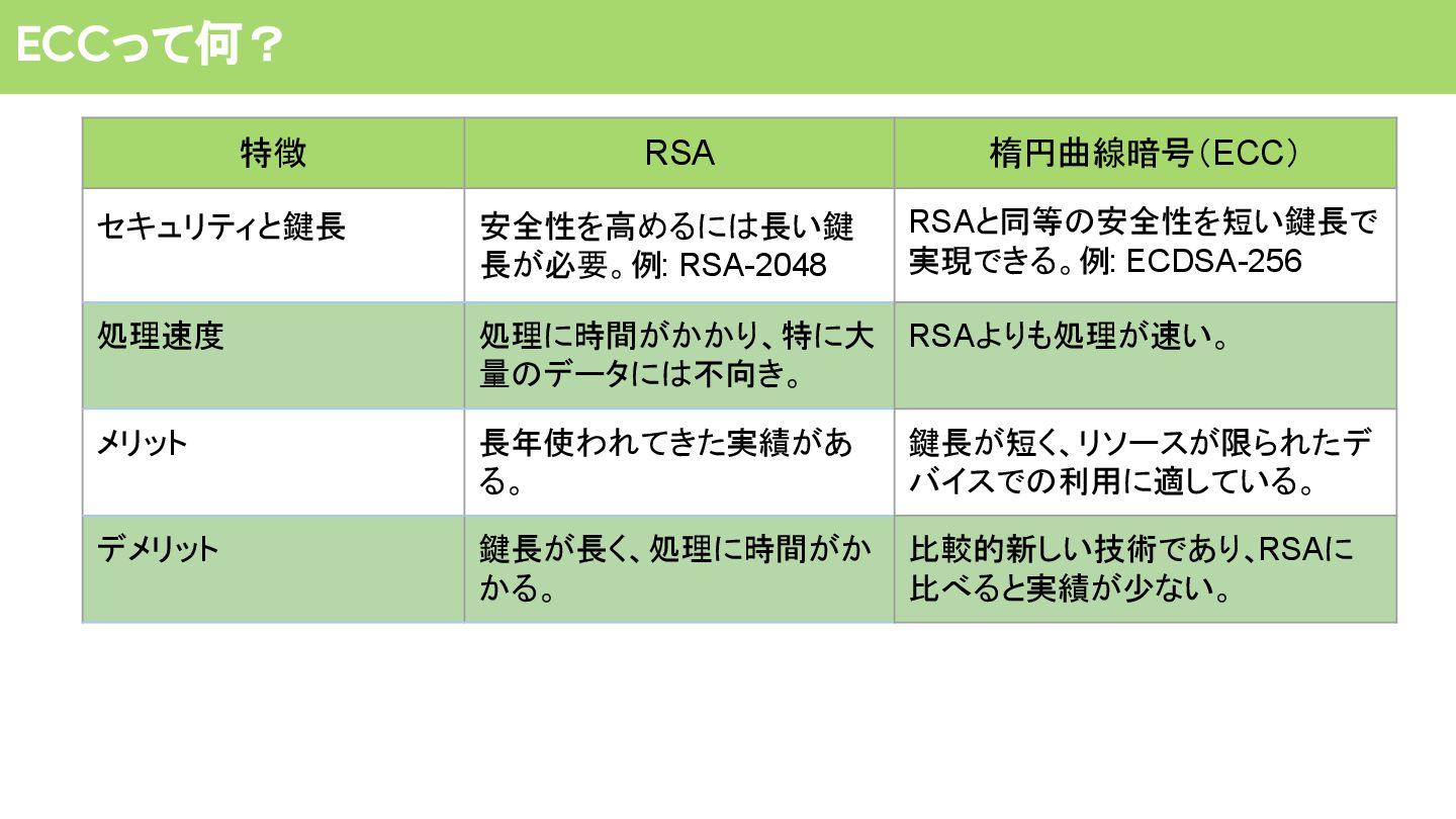 ECDSA-256 処理速度 処理に時間がかかり、特に大 量のデータには不向き。 RSAよりも処理が速い。 メリット 長年使われてきた実績があ る。 鍵長が短く、リソースが限られたデ バイスでの利用に適している。 デメリット 鍵長が長く、処理に時間がか かる。 比較的新しい技術であり、RSAに 比べると実績が少ない。