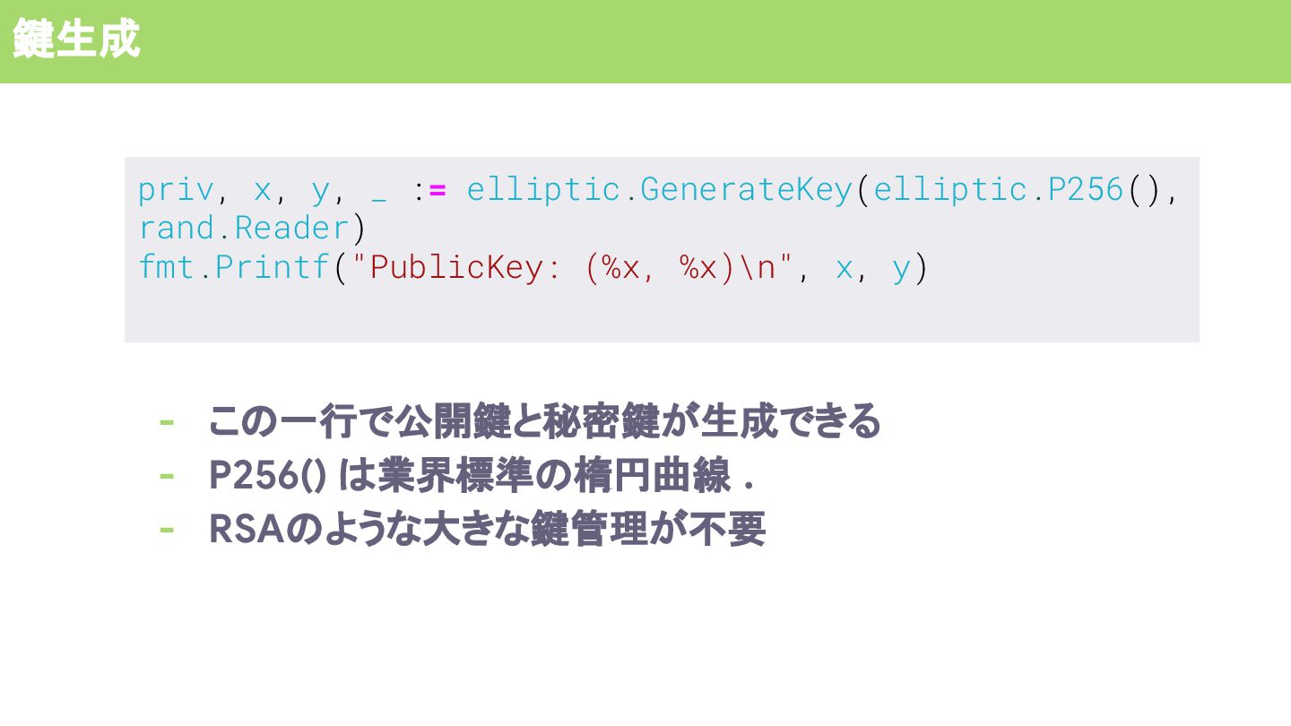 - この一行で公開鍵と秘密鍵が生成できる - P256() は業界標準の楕円曲線 . - RSAのような大きな鍵管理が不要 鍵生成 priv,