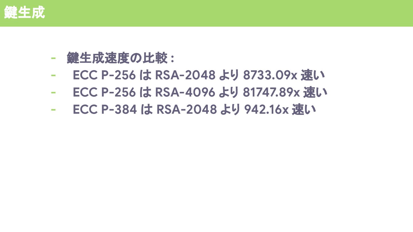 - 鍵生成速度の比較 : - ECC P-256 は RSA-2048 より 8733.09x