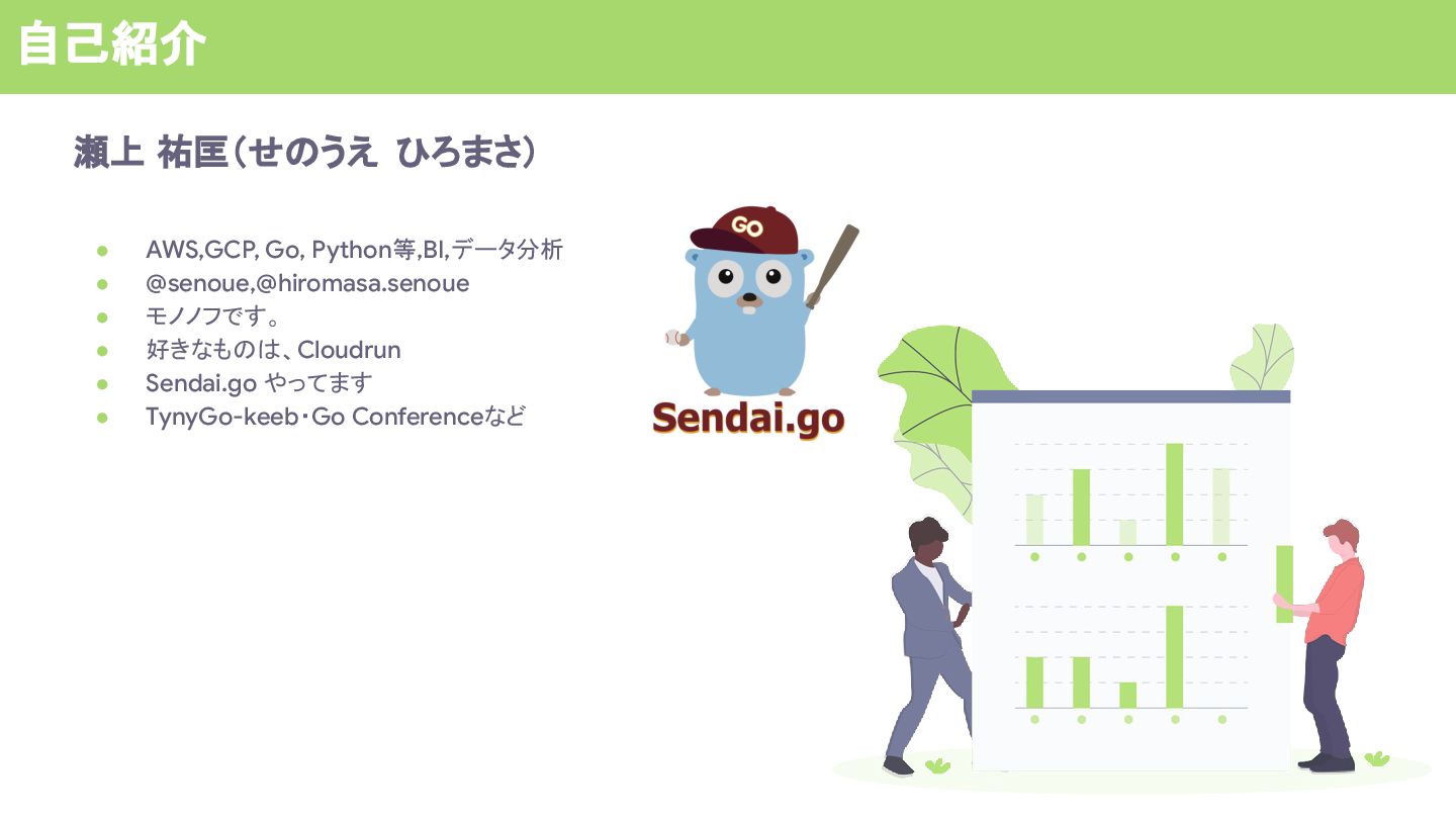 瀬上 祐匡(せのうえ ひろまさ) • AWS,GCP, Go, Python等,BI,データ分析 • @senoue,@hiromasa.senoue •