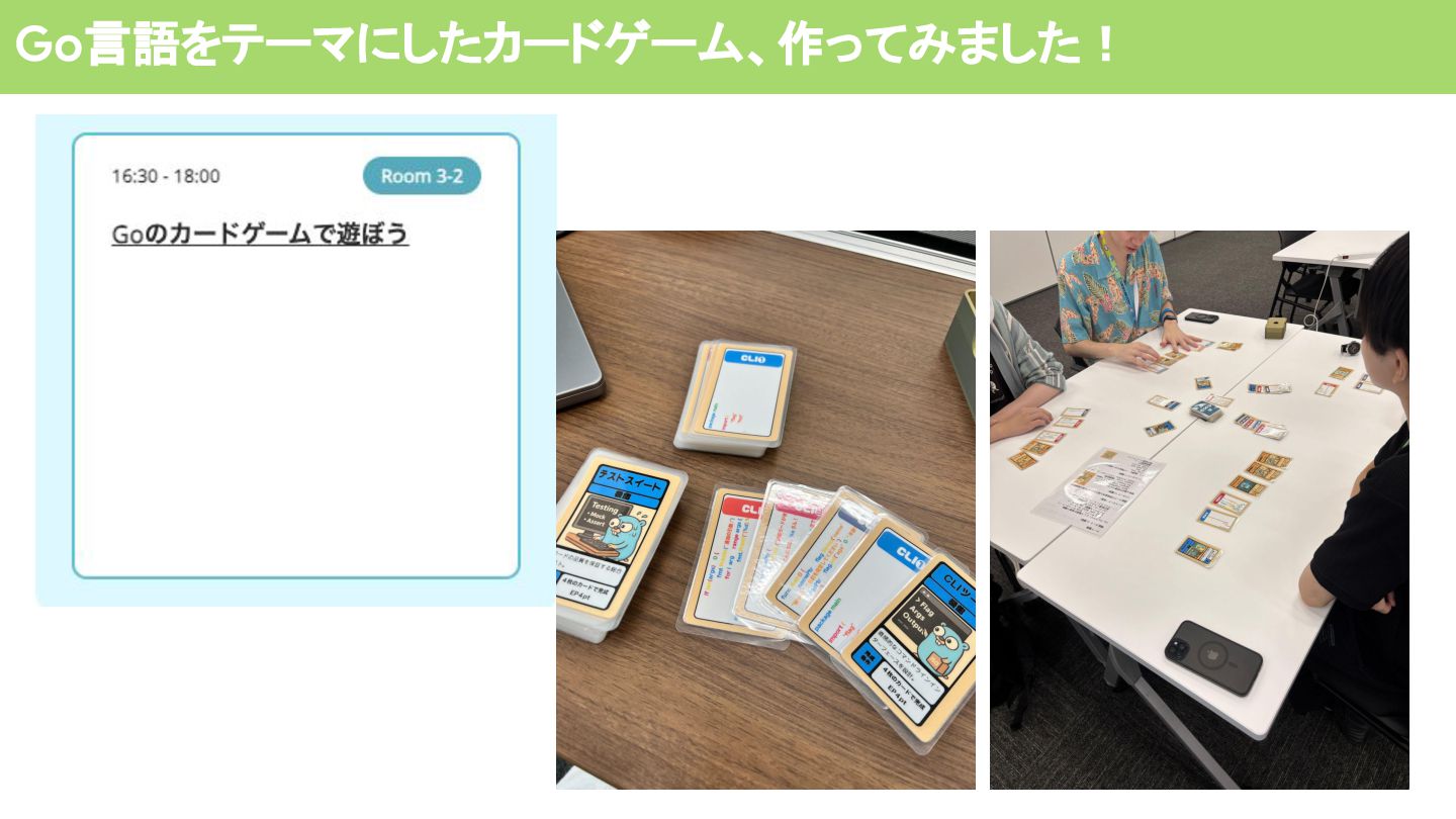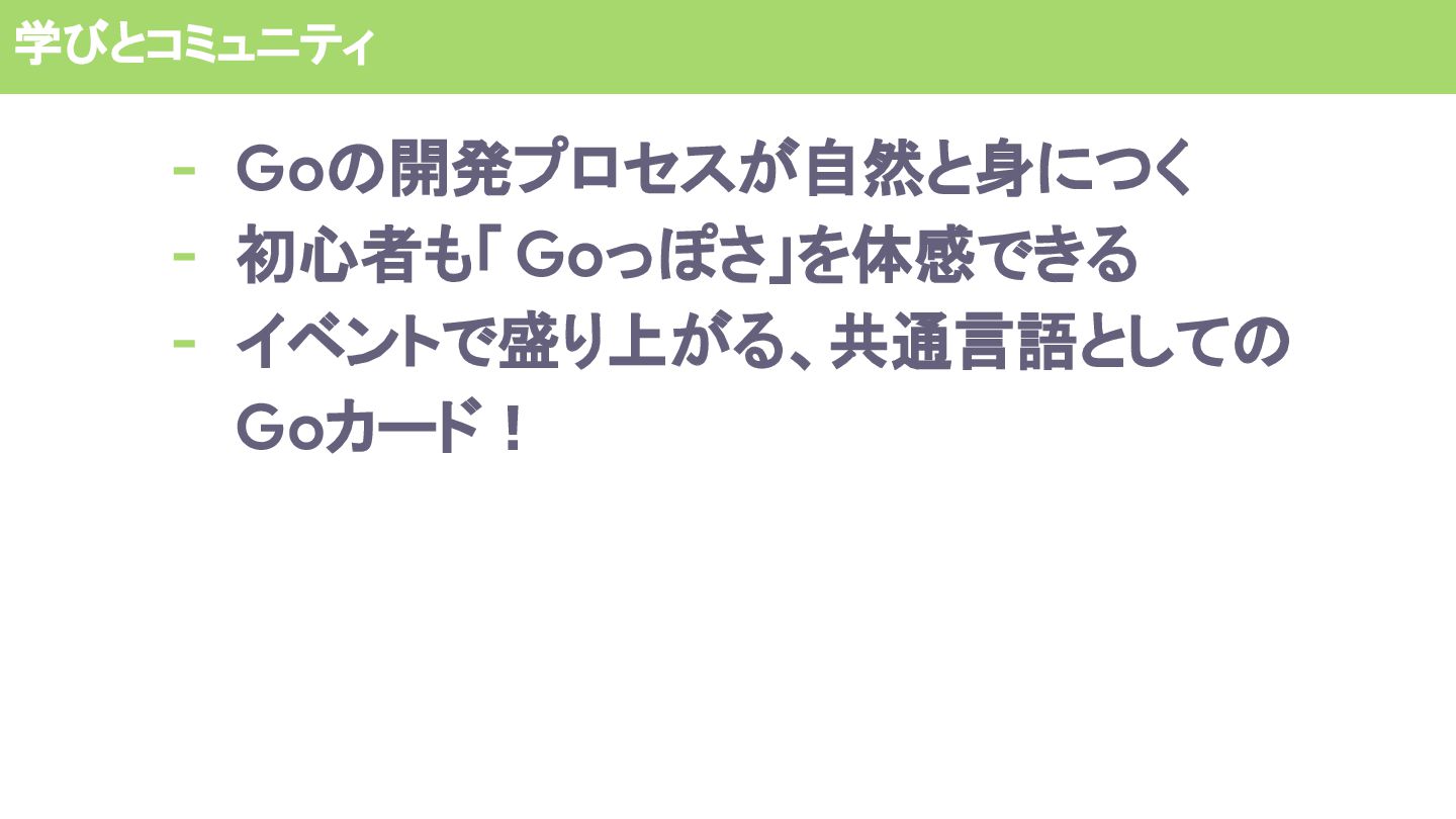 - Goの開発プロセスが自然と身につく - 初心者も「 Goっぽさ」を体感できる - イベントで盛り上がる、共通言語としての Goカード! 学びとコミュニティ