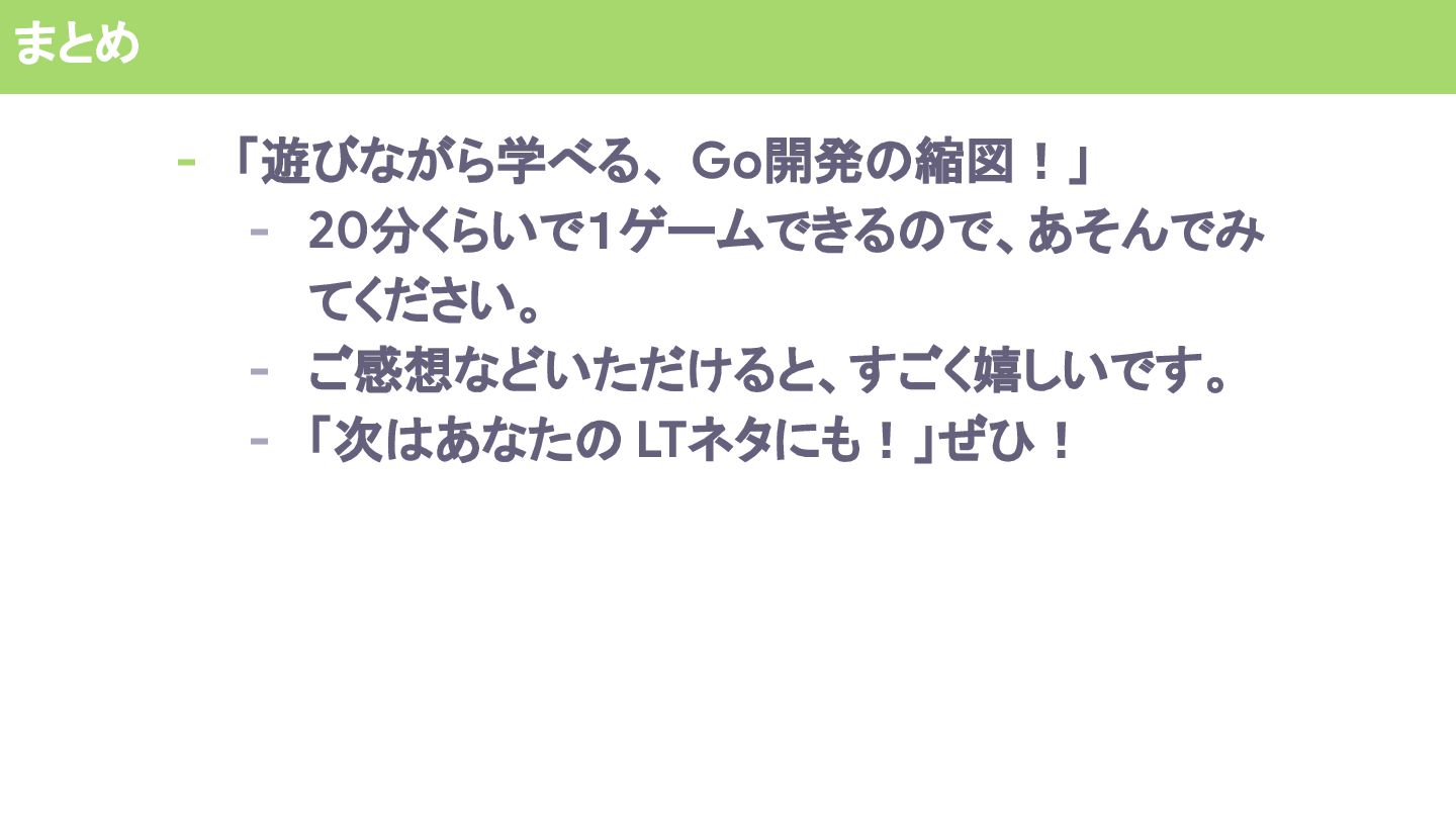 - 「遊びながら学べる、 Go開発の縮図!」 - 20分くらいで1ゲームできるので、あそんでみ てください。 - ご感想などいただけると、すごく嬉しいです。 - 「次はあなたの